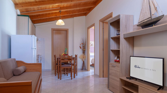 A relaxing atmosphere, modern decor with quality furnishings and fully equipped kitchen make for a great choice of self-catering accommodation close to Tolo beach. The apartments sleep 4-6 persons in two separate bedrooms, one with a double bed, the other with two single beds and a sofabed in the living area. In each kitchen, which has a normal size cooker, there is also a washing machine, a necessity for families away on holiday.